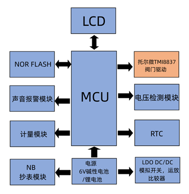 智能燃?xì)獗砝肕CU作為核心,控制無線模塊進(jìn)行數(shù)據(jù)傳輸實(shí)現(xiàn)遠(yuǎn)程抄表,RTC記錄時(shí)間日期等信息通過LCD屏幕進(jìn)行顯示,超級(jí)電容儲(chǔ)備能量驅(qū)動(dòng)閥門開啟閉合,作為計(jì)費(fèi)的核心部件,閥門的正常開關(guān)就顯得尤為重要,這就對(duì)驅(qū)動(dòng)芯片的性能提出了很高的要求,拓爾微電子作為國內(nèi)一線閥門驅(qū)動(dòng)品牌,產(chǎn)品設(shè)計(jì)制造技術(shù)成熟,滿足高性能及穩(wěn)定性的需求, H橋電機(jī)驅(qū)動(dòng)芯片TMI8837,DFN2x2-8的封裝,體積小,適用于智能燃?xì)獗淼榷喾N產(chǎn)品,非常適用此應(yīng)用場景。
