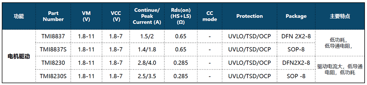 TMI8837是低壓直流有刷馬達(dá)驅(qū)動(dòng)芯片。內(nèi)部集成650mΩ(HS+LS典型)H橋NMOS開關(guān),輸入電壓范圍為1.8V~11V。峰值電流容量高達(dá)1.5A。TMI8837支持超低功耗休眠模式,內(nèi)置UVLO、熱關(guān)斷、OCP保護(hù)電路, 從電性能參、封裝等方面,推薦國產(chǎn)西安托爾微的TMI8837,可兼容替換TI的 DRV8837。在智能燃?xì)獗碇?,一般采用?節(jié)堿性電池給供電,所以對(duì)功耗要求非常嚴(yán)格。而托爾微電子的電機(jī)驅(qū)動(dòng)芯片TMI8837針對(duì)智能斷路器應(yīng)用設(shè)計(jì),EN腳低電平實(shí)現(xiàn)低功耗模式,VM睡眠模式電流45nA,VCC睡眠模式電流17nA,降低了整機(jī)功耗。