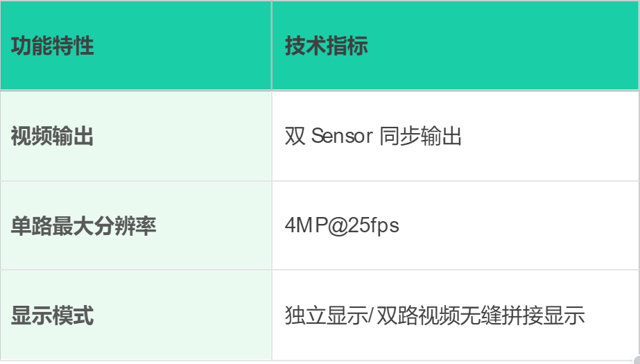 支持兩路不同Sensor同步輸出,雙路畫面獨(dú)立顯示或拼接顯示,同時(shí)可拼接兩路視頻輸出,實(shí)現(xiàn)更大視場(chǎng)角畫面。為當(dāng)前市場(chǎng)主流兩路Sensor輸出產(chǎn)品提供SoC解決方案。