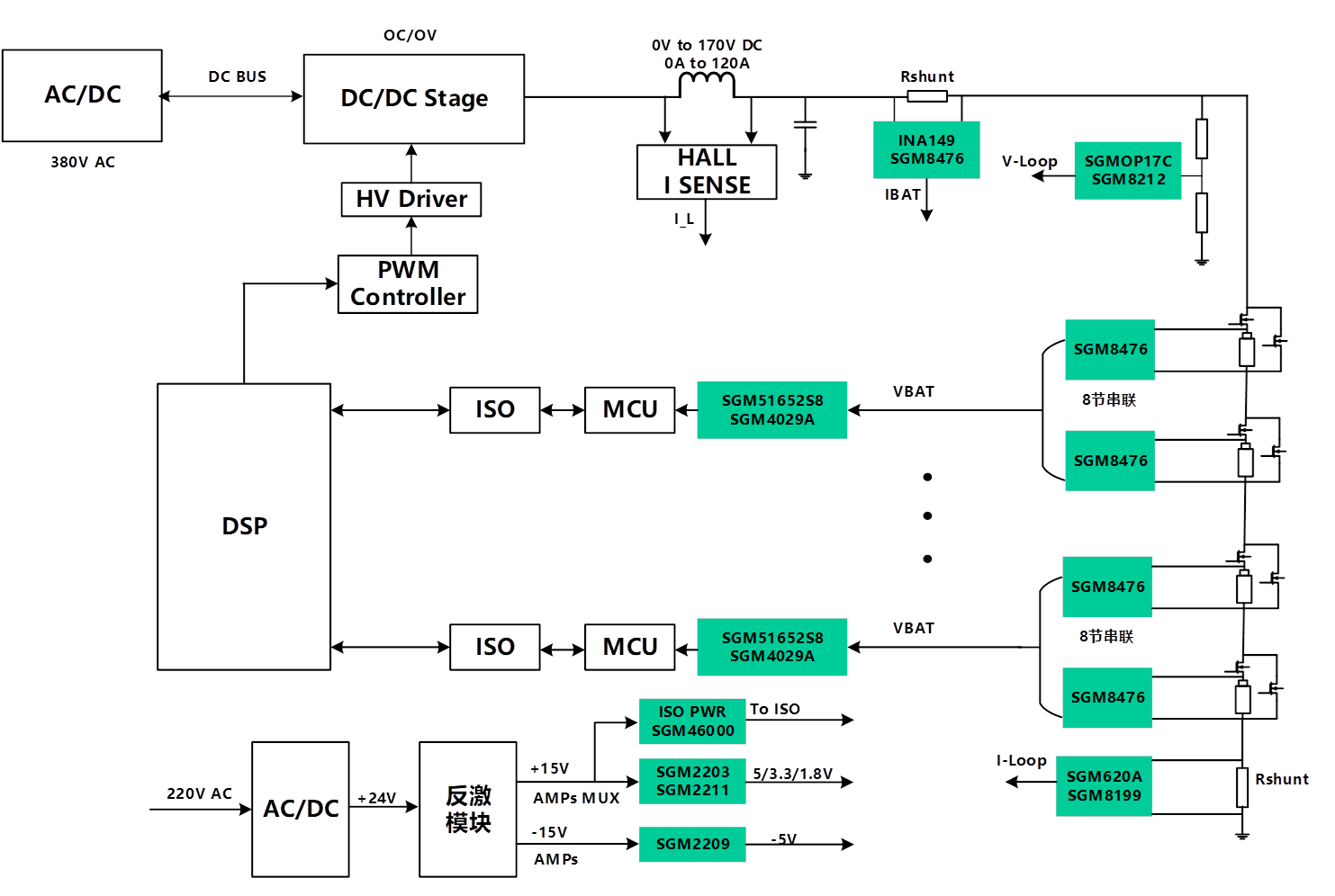 隨著個人便攜設備和新能源汽車快速發(fā)展,鋰電池市場需求持續(xù)增長,各個電池廠商對化成過程中鋰電池充放電電流/電壓測量的誤差要求也顯著提高,對整個測量控制電路中放大器、ADC/DAC、電壓基準的誤差要求也相應提高。同時,在激烈的市場競爭下,方案性價比高也是各個廠家要求之一。圣邦微電子能用更低成本實現(xiàn)更高精度、更高功率的電池化成I/V控制。