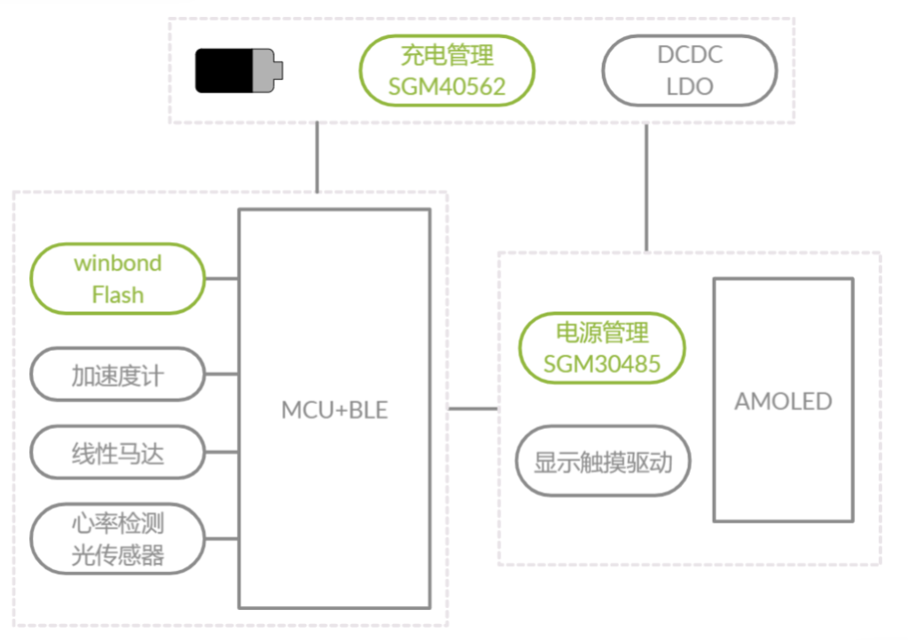SGM41100A設(shè)計(jì)用于初級(jí)保護(hù)聚合物可充電電池。。該芯片被焊接在智能手表的PCB上。它的小尺寸封裝讓電路工程師在PCB上有更好的設(shè)計(jì)空間。SGM41100A集成了低電阻斷開開關(guān)這個(gè)保護(hù)功能包括充電和放電保護(hù),檢測(cè)與充電過流保護(hù)等功能。