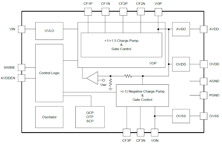 SGM38045是一顆采用×1/×1.5自適應(yīng)模式電荷泵結(jié)構(gòu)的無電感小尺寸AMOLED電源。以3.3V輸出為例,當(dāng)電源電壓VIN高于3.7V時(shí),主電荷泵工作在1倍壓輸出的Bypass直通模式,主輸出電壓VVOP≈VIN;當(dāng)電源電壓VIN低于3.7V時(shí),主電荷泵工作在1.5倍壓輸出的模式。此后經(jīng)AVDD、OVDD兩個(gè)LDO分別產(chǎn)生AVDD、OVDD兩個(gè)正壓輸出;經(jīng)負(fù)壓電荷泵(×(-1)NegaTIve Charge Pump),和LDO OVSS產(chǎn)生負(fù)壓OVSS。