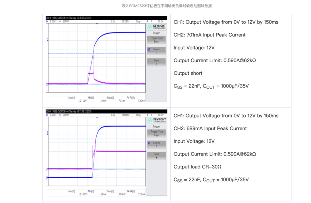 表2左右分別顯示了SGM2523評估板加載1000μF輸出電容短路啟動和加載1000μF輸出電容同時加載電子負(fù)載(CR-30Ω)軟啟動的測試數(shù)據(jù)。