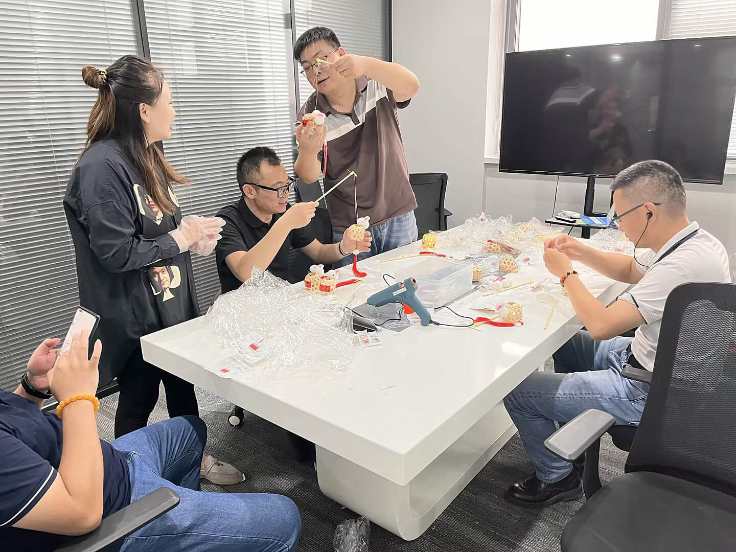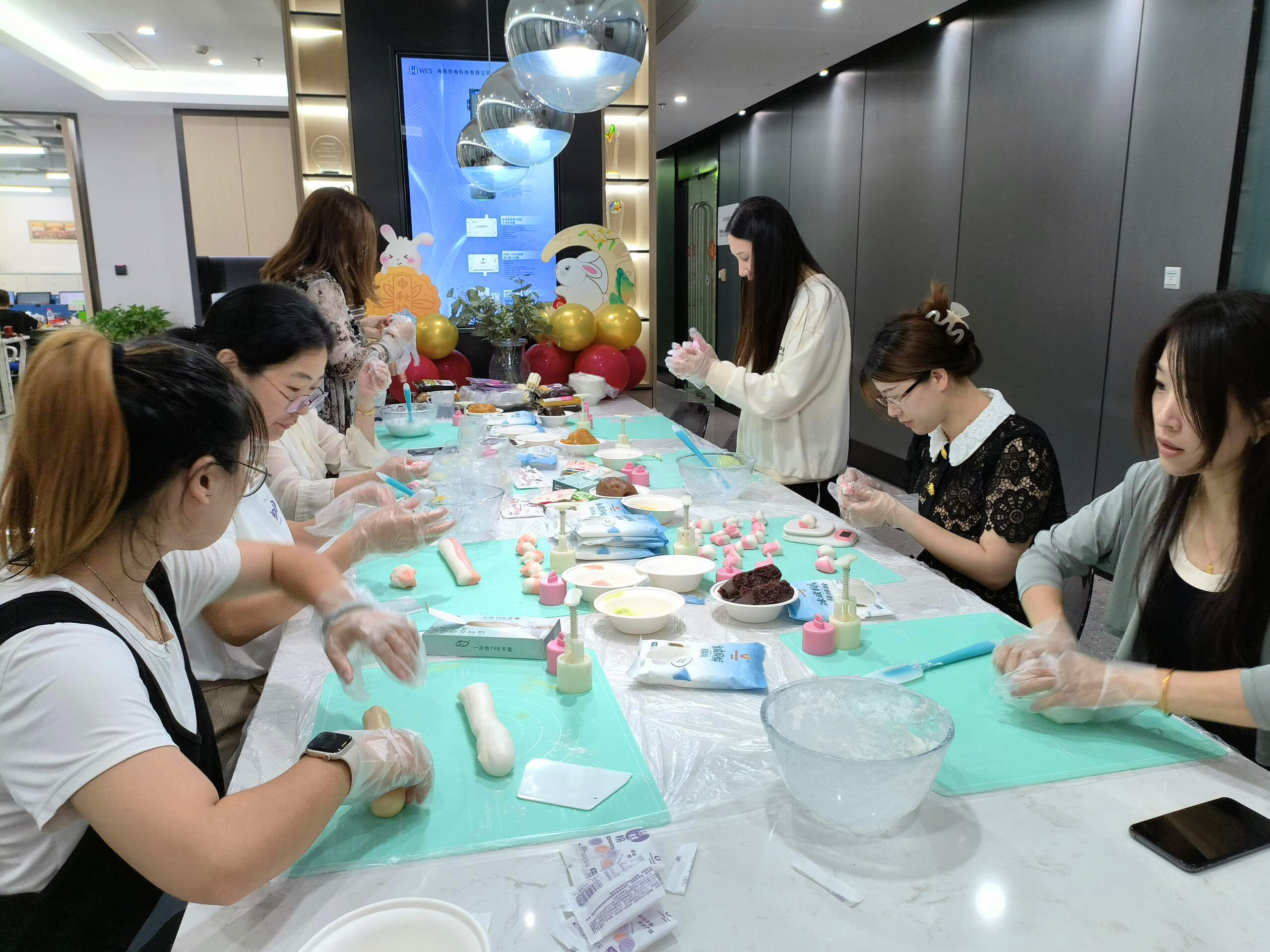 ?? 為慶祝中秋和國慶雙節(jié),行政人事部精心布置了會議室做為本次活動的主場館,長長的會議桌上放滿了月餅、美食、水果和飲料……營造出濃濃的節(jié)日氣氛。同時,在前臺大廳區(qū)域組織了“投壺換年假”、“組裝小燈籠”、“親手做月餅”等系列趣味性活動。