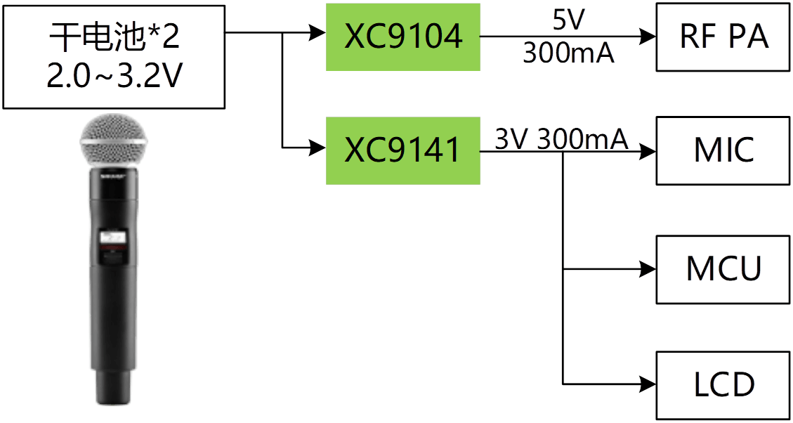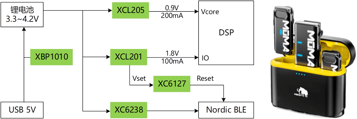 - 音頻功放供電及射頻PA供電,XC9147/1,XC9104升壓DCDC,優(yōu)秀電源紋波;高精度,低噪聲LDO XC6209/4,進一步提升電源表現(xiàn)