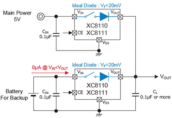 備用電池的連接方法通過使用理想二極管負(fù)載開關(guān)進(jìn)行OR連接,與肖特基二極管SBD相比,大幅度降低VF損失及漏電流