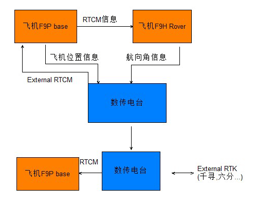 工作原理以及信號(hào)流程:飛機(jī)上的F9P base接入RTK信號(hào),與飛機(jī)上F9H(rover)構(gòu)成moving-base系統(tǒng),可以知道飛機(jī)的精確位置和航向角。但是有一個(gè)要求是base和rover的安裝距離需要大于30cm;數(shù)傳電臺(tái)需要把F9P base和F9H的2個(gè)串口信號(hào)合并到一起,傳回汽車端,這里面包含飛機(jī)位置信息,航向角信息以及RTCM信息;汽車上安裝F9P,接收數(shù)傳電臺(tái)的RTCM信號(hào),這樣構(gòu)成一個(gè)單RTK系統(tǒng),可以實(shí)時(shí)知道汽車和飛機(jī)的位置信息。