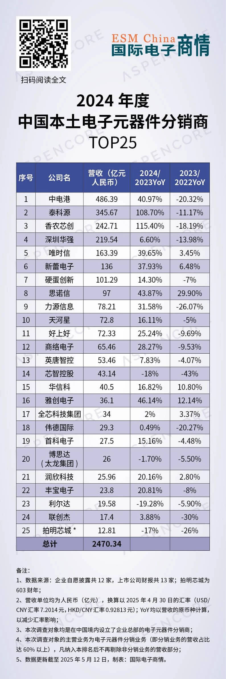 據(jù)不完全統(tǒng)計(jì),2024年度營(yíng)收超10億元人民幣(幣種下同)的本土分銷商還有:瑞凡微(10+億元,YoY +26%)。另外,由于韋爾股份(分銷業(yè)務(wù)營(yíng)收39.39億元,占公司總營(yíng)收的15%)、火炬電子(分銷業(yè)務(wù)營(yíng)收16.54億,占比59%)、睿能電子(分銷業(yè)務(wù)營(yíng)收11.06億,占比57%)的分銷業(yè)務(wù)營(yíng)收占比未達(dá)60%,所以暫未納入本排名。
