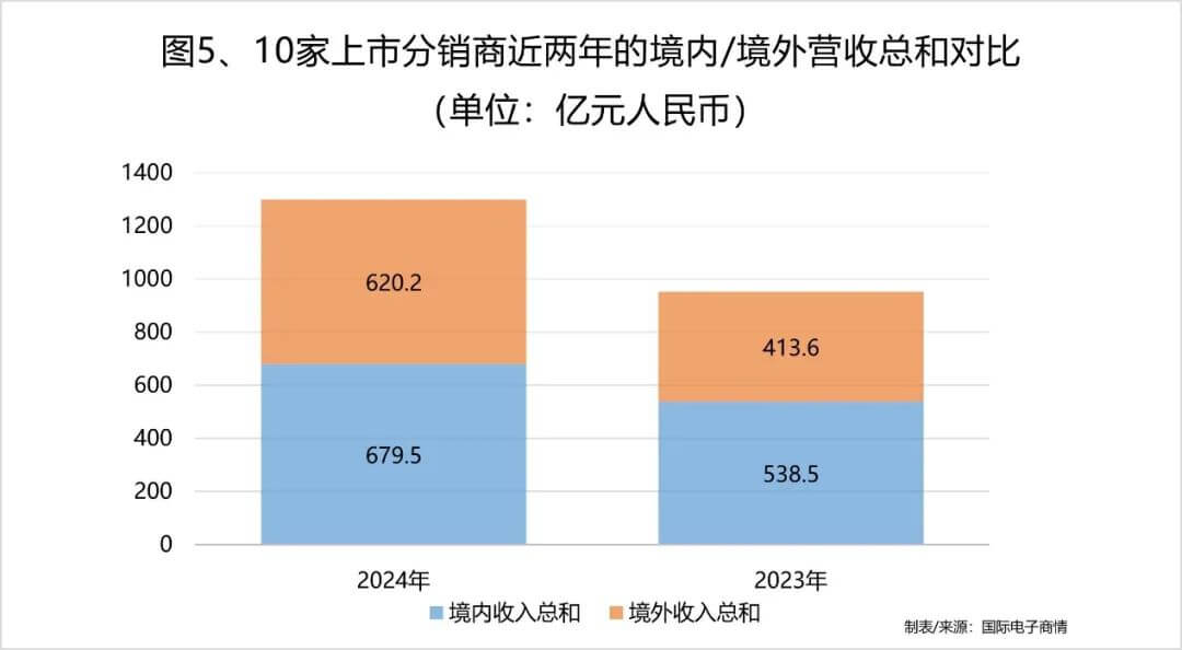 在過(guò)去的2024年里,“出?!苯^對(duì)是一個(gè)高頻詞。那么,分銷商的出海進(jìn)度如何?我們收集了10家上市分銷商的境內(nèi)外收入數(shù)據(jù),分析可知:境內(nèi)市場(chǎng)仍是主力,但境外市場(chǎng)增長(zhǎng)潛力更大。