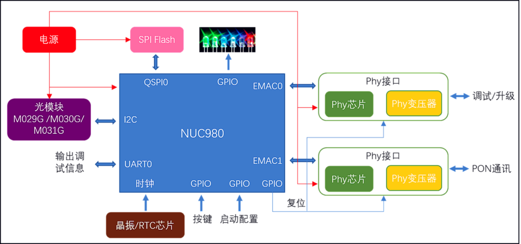 由于OLT設(shè)備需長時間不斷電穩(wěn)定工作,新唐NUC980以其雙網(wǎng)口、300MHz主頻、內(nèi)置DDR和支持Linux系統(tǒng)等優(yōu)勢非常適合于工控行業(yè)應(yīng)用,NUC980負(fù)責(zé)對PON芯片進(jìn)行配置管理等。