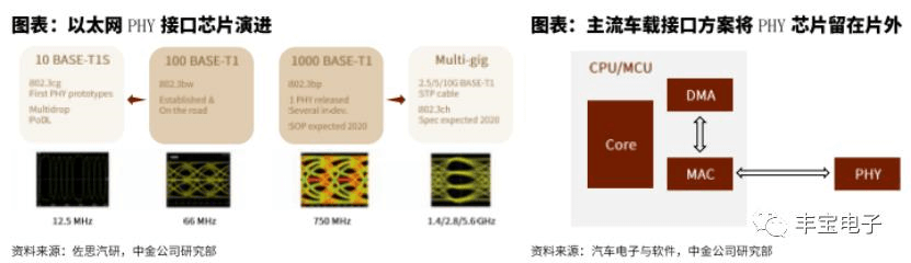 車載以太網目前已廣泛布局各車型中,深入ADAS系統(tǒng)。在硬件層面,車載以太網的接口電路主要由MAC控制器和物理層接口PHY芯片兩大部分構成。集成方式上,嵌入式芯片廠商一般會將MAC集成在MCU/CPU內部,而PHY芯片則由OEM或控制器供應商提供獨立芯片。PHY與MAC之間通過MII接口(media independent interface,媒體獨立接口),在MAC結構不發(fā)生變化的情況下,更換不同PHY芯片不會影響車內通信。