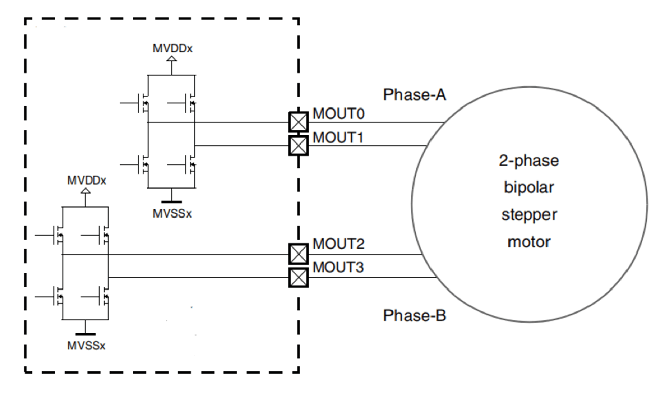 NSUC1610 集成了 4 個(gè)半橋,通過(guò)兩兩組合形成兩個(gè) H 橋連接,具體連接如圖所示: