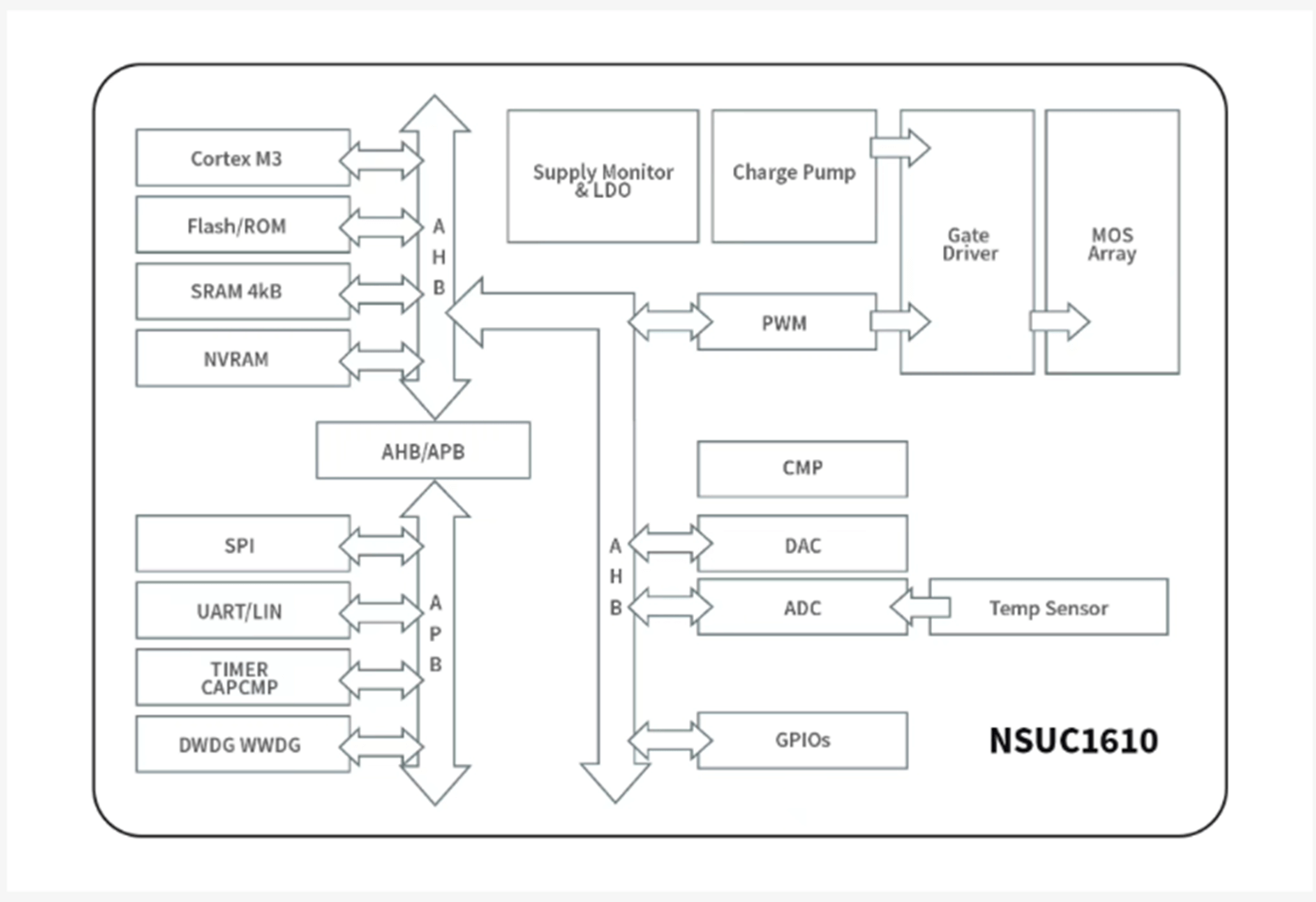 NSUC1610是一種集成驅(qū)動(dòng)和4路半橋的微控制器,主要用于控制小功率直流電機(jī),可支持驅(qū)動(dòng)直流有刷電機(jī)、直流無(wú)刷電機(jī)、步進(jìn)電機(jī)等,在新能源汽車中廣泛使用。該芯片采用先進(jìn)的高溫高壓工藝,節(jié)溫最高可支持到 175°C,電壓耐壓最高可到 40V,且具有過(guò)壓保護(hù)功能,LIN 端口能夠支持-40V~40V 耐壓,BVDD引腳可支持-0.3~40V 耐壓。芯片采用的是ARM Cortex-M3內(nèi)核,該內(nèi)核使用獨(dú)立的數(shù)據(jù)總線和地址總線,能夠提高取指令和取數(shù)據(jù)的效率。