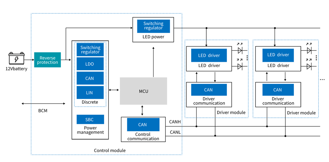 應(yīng)用案例該方案主要包括控制板和燈板兩部分,使用納芯微12通道LED驅(qū)動(dòng)NSL21912、電源芯片NSR33050和CAN收發(fā)器NCA1042B。