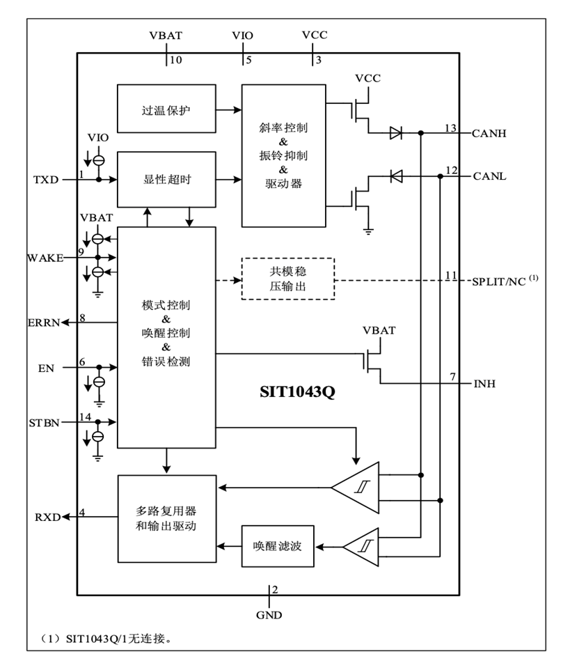 SIT1043QT是一款應(yīng)用于 CAN 協(xié)議控制器和物理總線之間的接口芯片,支持 5Mbps 靈活數(shù)據(jù)速 率(Flexible Data-Rate),具有在總線與CAN協(xié)議控制器之間進(jìn)行差分信號(hào)傳輸?shù)哪芰?。SIT1043QT總線端口耐壓可達(dá)-58V 至+58V,接收器共模輸入電壓達(dá)到-30V 至+30V,適用于 12V 或 24V 應(yīng)用系統(tǒng)。 SIT1043QT 采用多電源供電,擁有多種系統(tǒng)保護(hù)和診斷功能以提高器件和 CAN 的穩(wěn)定性。另外, SIT1043QT擁有五種工作模式:正常工作模式、靜音模式、待機(jī)模式、睡眠等待模式和睡眠模式,在低 功耗模式下支持本地喚醒與遠(yuǎn)程喚醒,所提供的低功耗模式管理可極大節(jié)省 CAN 總線應(yīng)用系統(tǒng)的電力 。