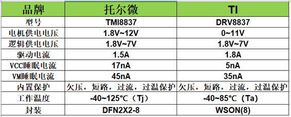 TMI8837是低壓直流有刷馬達(dá)驅(qū)動(dòng)芯片。內(nèi)部集成650mΩ(HS+LS典型)H橋NMOS開關(guān),輸入電壓范圍為1.8V~11V。峰值電流容量高達(dá)1.5A。TMI8837支持超低功耗休眠模式,內(nèi)置UVLO、熱關(guān)斷、OCP保護(hù)電路, 從電性能參、封裝等方面,推薦國產(chǎn)西安托爾微的TMI8837,可兼容替換TI的 DRV8837。在智能燃?xì)獗碇?,一般采用?節(jié)堿性電池給供電,所以對(duì)功耗要求非常嚴(yán)格。而托爾微電子的電機(jī)驅(qū)動(dòng)芯片TMI8837針對(duì)智能斷路器應(yīng)用設(shè)計(jì),EN腳低電平實(shí)現(xiàn)低功耗模式,VM睡眠模式電流45nA,VCC睡眠模式電流17nA,降低了整機(jī)功耗。