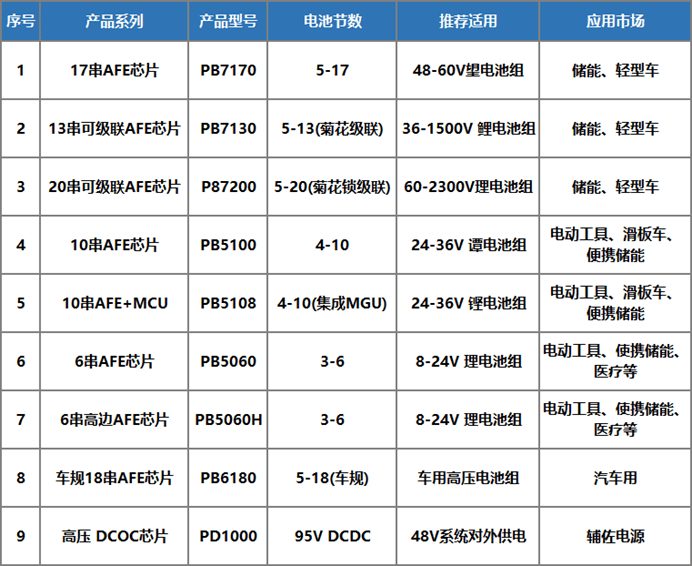 鵬申P(guān)B7170(17串電池AFE)是工業(yè)48V/60V鋰電池組標(biāo)準(zhǔn)解決方案芯片, 廣泛應(yīng)用于電動(dòng)自行車、機(jī)器人、UPS等領(lǐng)域。此外PB7130/PB7200分別單顆支持4-13/20串電池級(jí)聯(lián)應(yīng)用,且可擴(kuò)展菊花鏈,可實(shí)現(xiàn)24V-400V三元或磷酸鐵理電池組管理,為儲(chǔ)能市場(chǎng)提供極佳的多樣選擇。