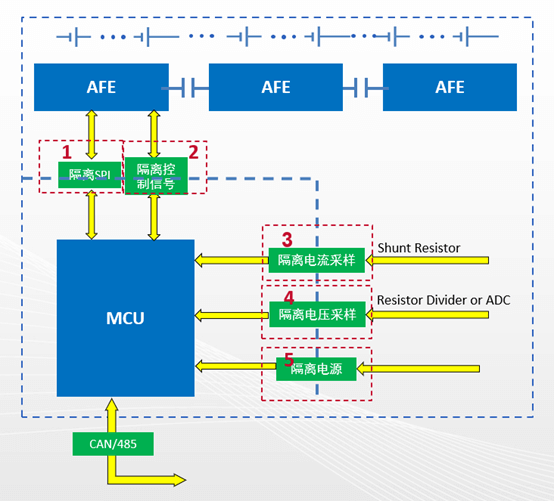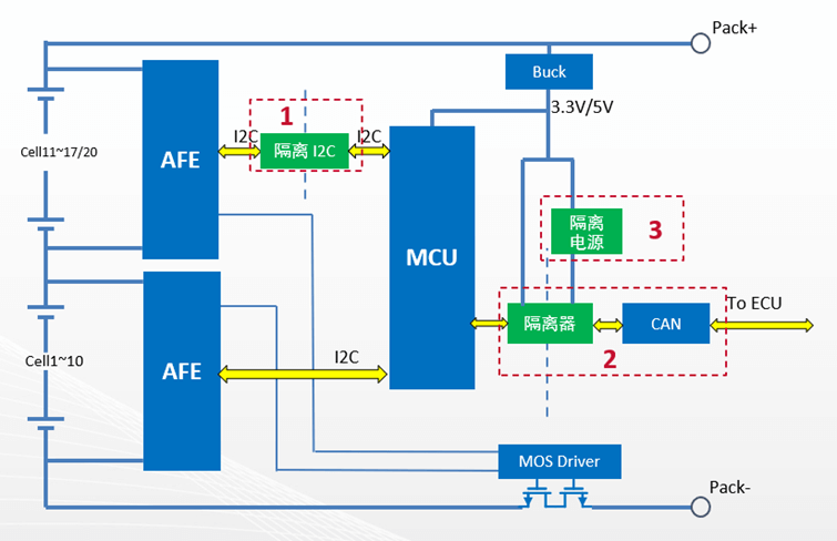 BMS上有低壓電路,也有高壓電路,高低壓電路之間是需要進(jìn)行通信的,如AFE與MCU之間SPI/I2C/UART通信,及MCU與外界CAN/RS485通信;高電壓電路通信需設(shè)計(jì)良好隔離,以隔絕直流,, 保護(hù)操作人員和低壓電路免受高電壓影響, 防止通信子系統(tǒng)之間的地電位差, 改善抗噪性能。