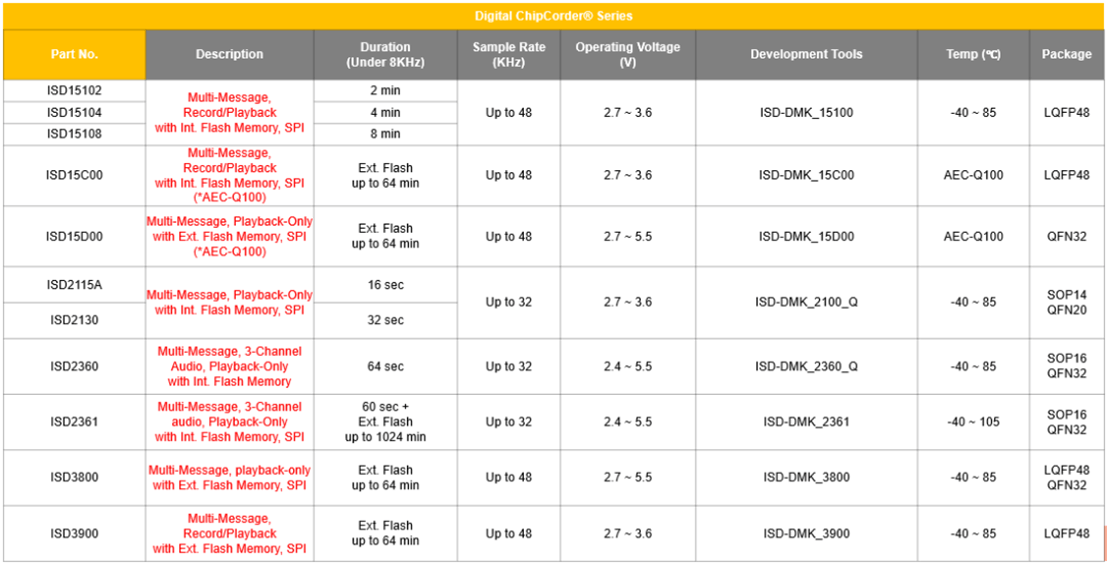 在車載應用中,新唐科技針特別對車規(guī)的需求,設計符合AEC-Q100車規(guī)級認證的產品ISD15C00和ISD15D00。目前已在知名品牌車企中作為重要的優(yōu)選料號,詳細的產品選型目錄如下: