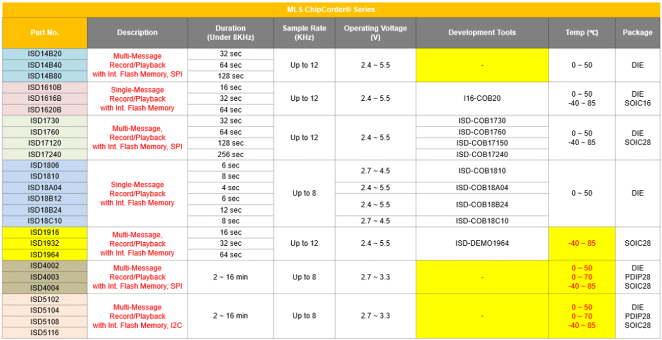 ISD Chipcorder(單芯片語音錄放器),用于語音、音頻錄制和回放的最佳解決方案;具備數字壓縮,優(yōu)化儲存管理,錄音時長靈活選擇,整合式的模擬/數字音頻信號的路徑,使音頻應用更方便簡單,輸出內置功放(Class AB/D),可直接驅動喇叭。