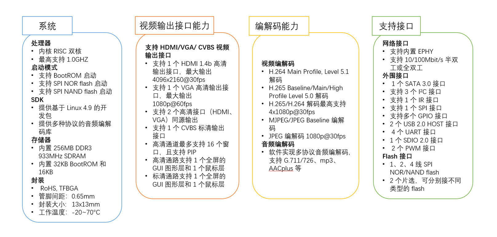 富瀚 MC6810E 采用RISC雙核處理器,最高工作頻率支持1.0GHZ,最大支持 4K30 幀輸出,運行Linux系統(tǒng),具備優(yōu)秀的解碼能力和豐富的接口。其主要特點如下: