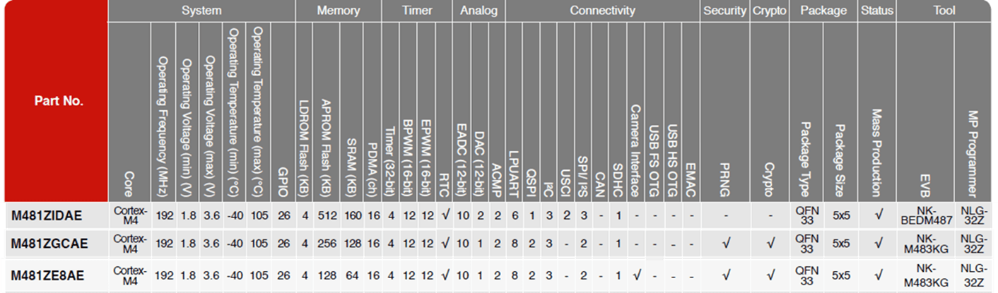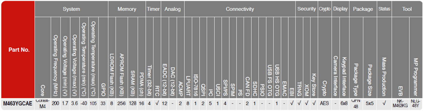新唐推出QFN33 5mmx5mm 小封裝MCU M481ZxxxAE、M463YGCAE,基于Cortex-M4核最高200 MHz主頻、最高512 KB Flash、最大160 KB SRAM (M481) 、最多8+1路LPUART、高達(dá)4路SPI (M463) 、最多5路I2C (M463)、可以運(yùn)行FFT算法。