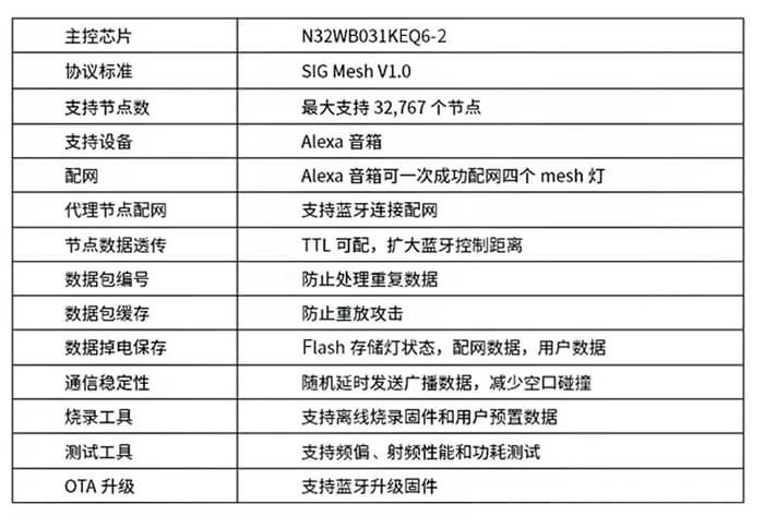 基于N32WB031系列實現(xiàn)的Mesh燈控方案具有如下功能特性: