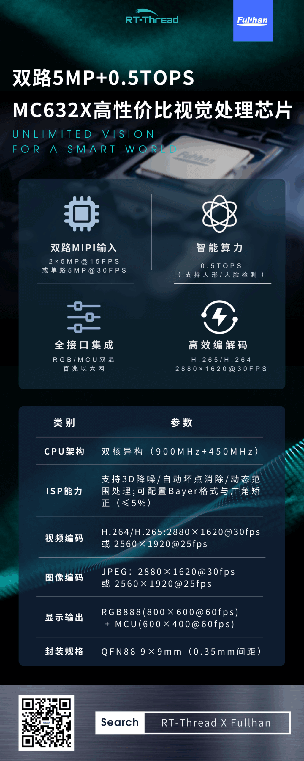 在智能視覺技術(shù)高速發(fā)展的浪潮中,行業(yè)對(duì)芯片性能、能效比和開發(fā)效率的需求正呈現(xiàn)爆發(fā)式增長。面對(duì)多路高清視頻處理、實(shí)時(shí)智能分析和快速產(chǎn)品化落地的三重挑戰(zhàn),RT-Thread操作系統(tǒng)攜手MC632X智能視覺處理器,帶來了突破性的解決方案。MC632X憑借高效快速、雙路顯示、全場(chǎng)景適配三大核心優(yōu)勢(shì)重新定義邊緣視覺處理。