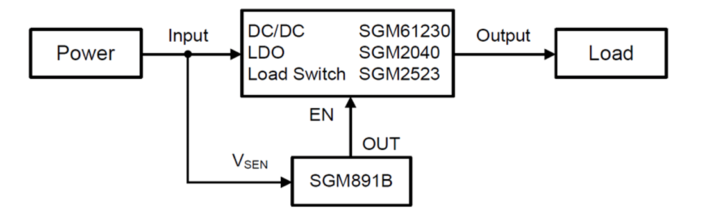 應用框圖所示,電源輸出接后級DC/DC、LDO或負載開關,同時采用電壓監(jiān)控器SGM891B監(jiān)控電源的輸出電壓,電壓監(jiān)控器輸出端OUT控制DC/DC(SGM61230等)、LDO(SGM2040等)或負載開關(SGM2523等)的使能端EN。在實際應用中: