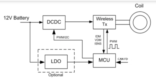 車載手機無線充電的原理框圖如圖所示,由一顆寬電壓輸入的DCDC,一顆無充電發(fā)射(集成POWer Stage),一顆通用MCU和一顆高壓LDO組成。無線充電發(fā)射端將IDMNDMISNS信號送給MCU.MCU根據(jù)設備端所重功率,一方面通過PWM或者12C調(diào)節(jié)DCDC的電壓,一方面調(diào)節(jié)發(fā)射端內(nèi)部Power Stage的工作占空比,從而調(diào)節(jié)發(fā)射端的輸出功率。這里LDO用來給MCU供電,是optiona選項,也可由無線充電發(fā)射端內(nèi)部集成的buck來實現(xiàn)。
