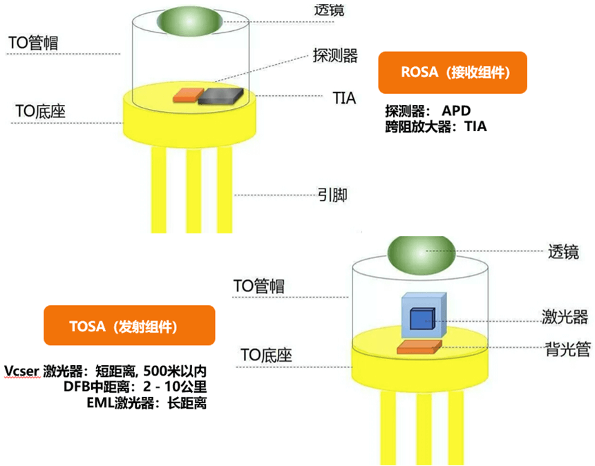 ROSA:實(shí)現(xiàn)光/電轉(zhuǎn)換,主要包括PD/APD、DeMux、耦合組件等,封裝類型一般和TOSA相同。PD用于短距、中距的光模塊,APD主要應(yīng)用于長(zhǎng)距光模塊。