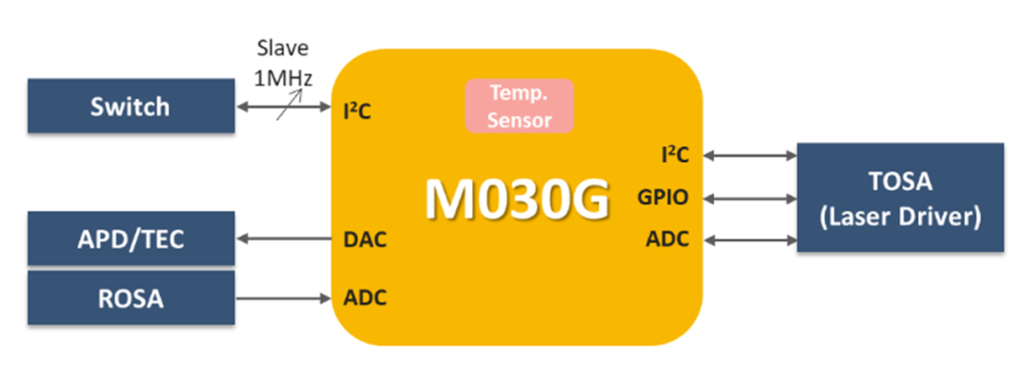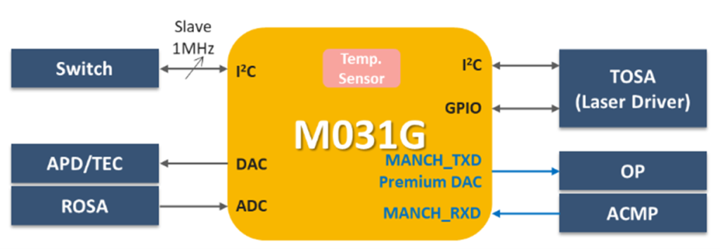 光模塊兩端分別連接了電口及光口,并在電口端利用I2C與上位機(jī)溝通。光模塊光功率會(huì)受溫度變化的影響,需監(jiān)控光模塊的溫度,并提供參考電壓做調(diào)整。因此MCU須具備量測(cè)溫度的能力—溫度傳感器,以及測(cè)量和調(diào)整電壓的能力—ADC/DAC。此外光模塊封裝尺寸狹小,因此 MCU 也必須為小封裝。 新唐的 NuMicro M029G/M030G/ M031G系列專為光模塊所設(shè)計(jì),除了充足的DAC及ADC之外,皆內(nèi)建溫度傳感器、提供QFN24及QFN33的小封裝選擇,并且配有兩組I2C接口,出廠預(yù)燒 I2C Bootloader,滿足光模塊的需求。