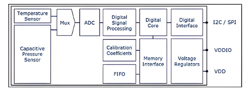 HP303B,特點:是一款小型化數(shù)字氣壓傳感器,具有高精度和低電流消耗等特點,并且能夠測量壓力和溫度。器件采用密封電容式傳感元件。
