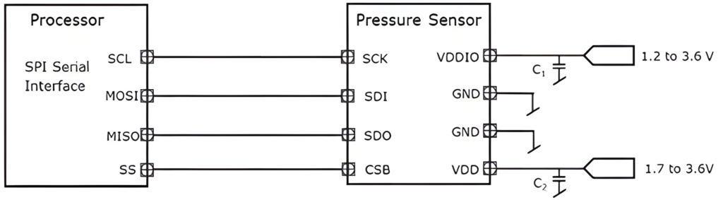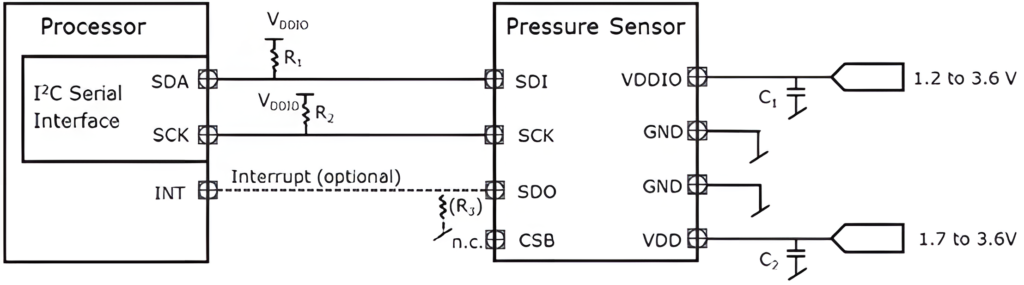 應(yīng)用程序中使用這些系數(shù)將測量結(jié)果轉(zhuǎn)換為高精度壓力和溫度值。FIFO的結(jié)果可以存儲多達32個測量結(jié)果,從而降低了主機處理器輪詢速率。主機可以通過串行I2C或SPI接口讀取傳感器的測量和校準系數(shù),傳感器的測量狀態(tài)可以通過SOD管腳上產(chǎn)生的中斷進行判斷。