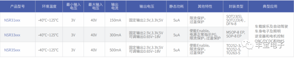 NSR31/33/35系列提供給硬件設(shè)計者充足的解決方案,有各種固定電壓版本:2.5V、3.3V和5.0V,也提供輸出可調(diào)選項(0.65V至18V)。此外,不同系列分別提供150mA,300mA,500mA的輸出電流能力,可由芯片內(nèi)部限制。此低功耗線性調(diào)節(jié)器還內(nèi)部集成了短路保護(hù)、過溫保護(hù)功能。 這些器件可在-40℃至125℃的環(huán)境溫度下運(yùn)行,提供多種封裝SOT223,SOT23DFN-8, MSOP-8 EP, SOP-8EP,TO252, TO263等,滿足不同設(shè)計需求。