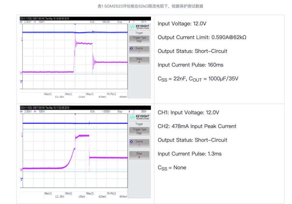 表1顯示了SGM2523評估板在輸入電壓/電流(12.0V/0mA~12.0V/120mA)、輸出電流限值0.590A@62kΩ時的短路保護測試數(shù)據(jù)