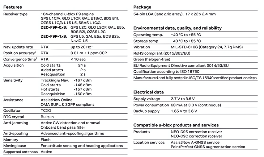 特點(diǎn):ublox公司作為全球領(lǐng)先的定位與無(wú)線通信技術(shù)供應(yīng)商,結(jié)合自身綜合實(shí)力與采用最新推出的u-blox F9平臺(tái)的技術(shù),核心創(chuàng)新研發(fā)出可在數(shù)秒內(nèi)提供穩(wěn)定的高精度定位產(chǎn)品ZED-F9P。