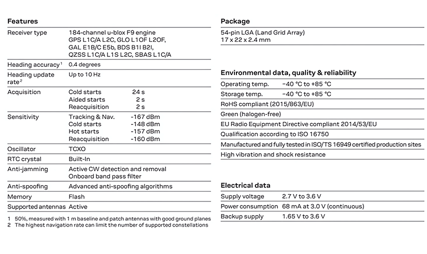 ZED-F9H作為附帶模塊,要求在同一設(shè)備上安裝ZED-F9P模塊。在該裝置中,ZED-F9P提供精確的GNSS位置,同時(shí)作為ZED-F9H模塊的移動(dòng)基座,ZED-F9H模塊輸出精確的姿態(tài)信息。由于航向信息是基于全球?qū)Ш叫l(wèi)星系統(tǒng)的,因此不需要預(yù)先校準(zhǔn),從而確保易于生產(chǎn)、集成和操作。精確的航向信息總是可用的,即使在靜止的情況下。ZED-F9H設(shè)計(jì)用于降低標(biāo)題應(yīng)用程序的系統(tǒng)成本,并具有最小的電子BOM。由于其體積小,重量輕,功耗低,非常適合大眾市場(chǎng)的采用。